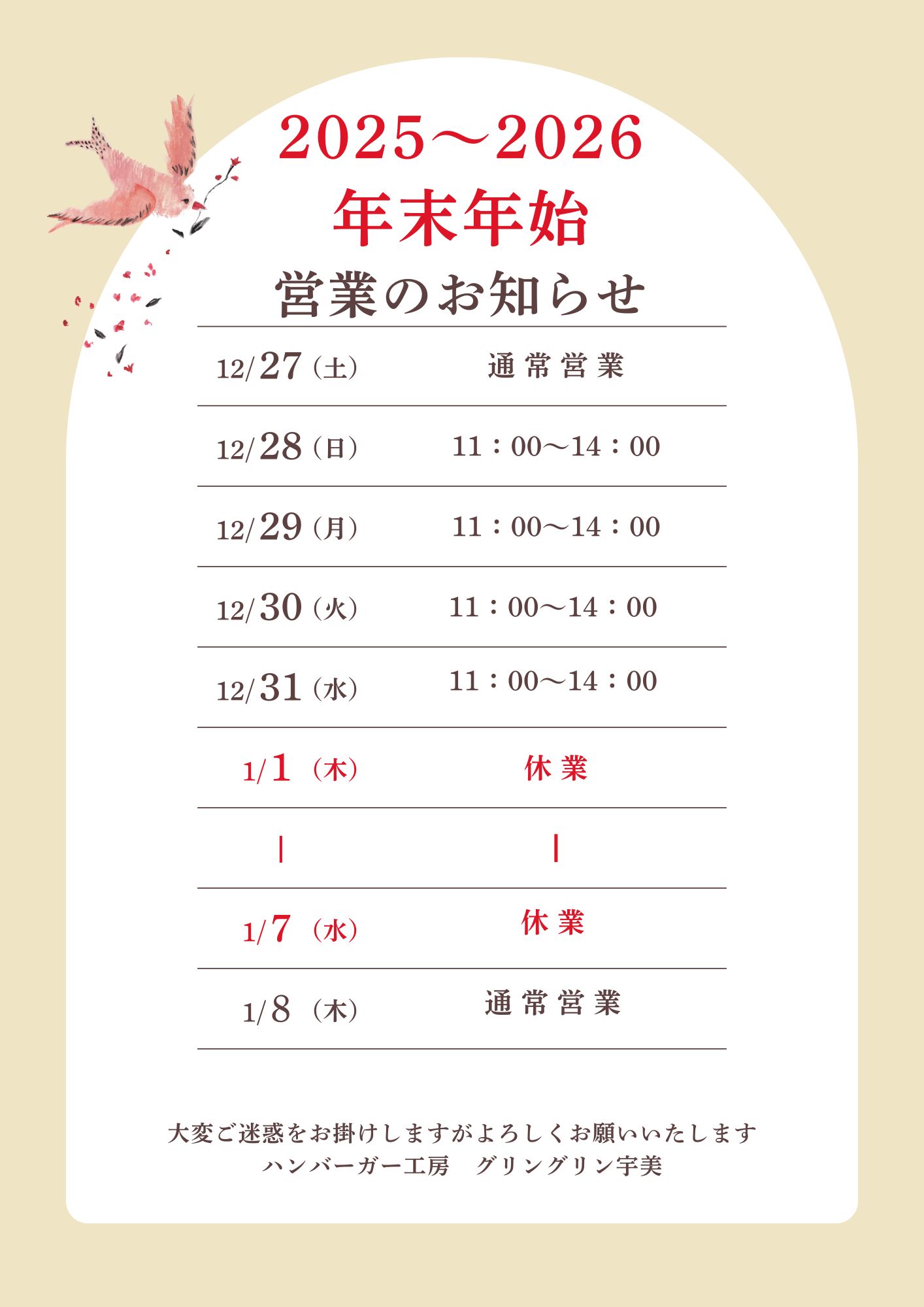 12月28日(日)~12月31日(水)まで11時~14時迄の時短営業。