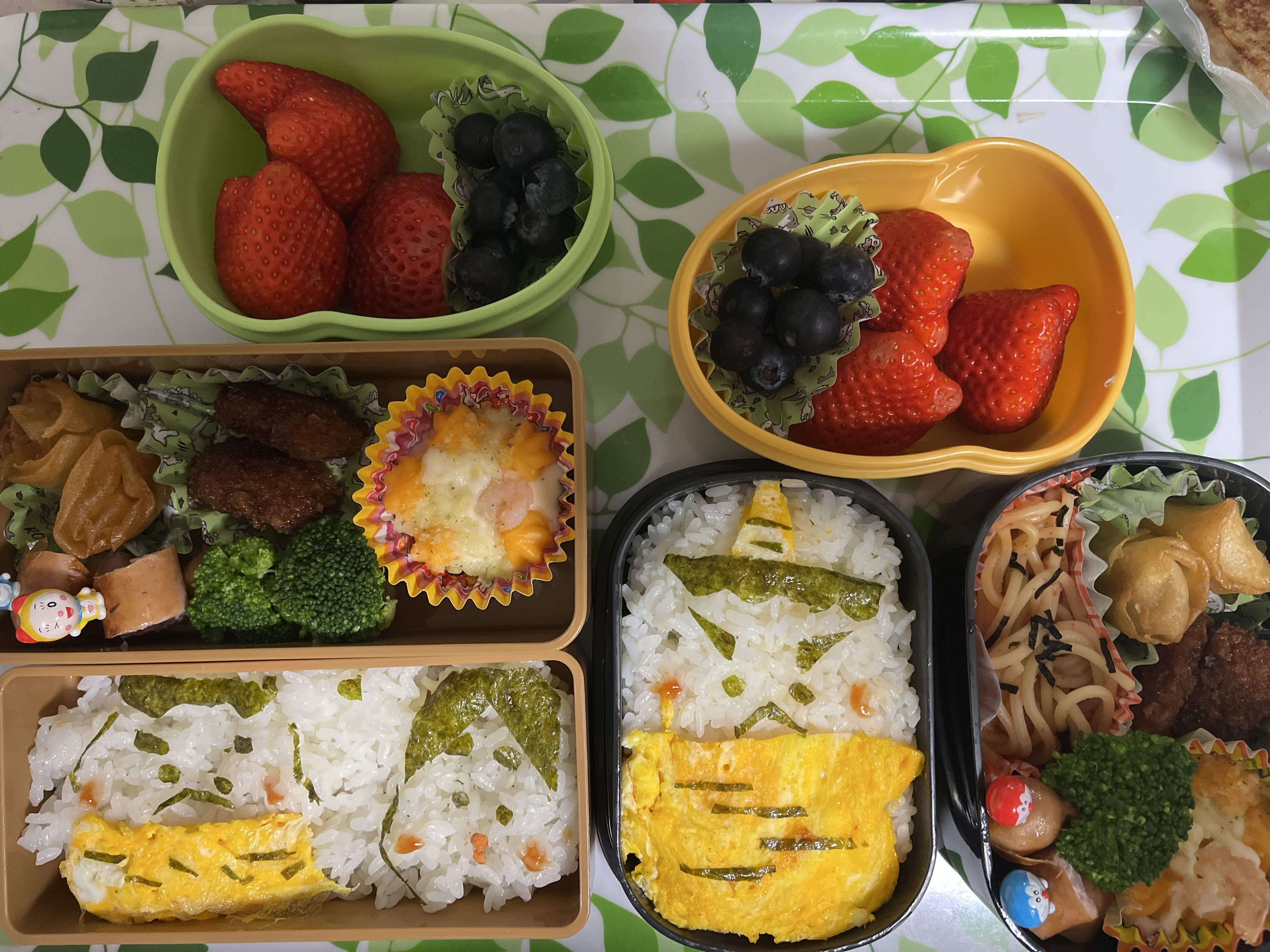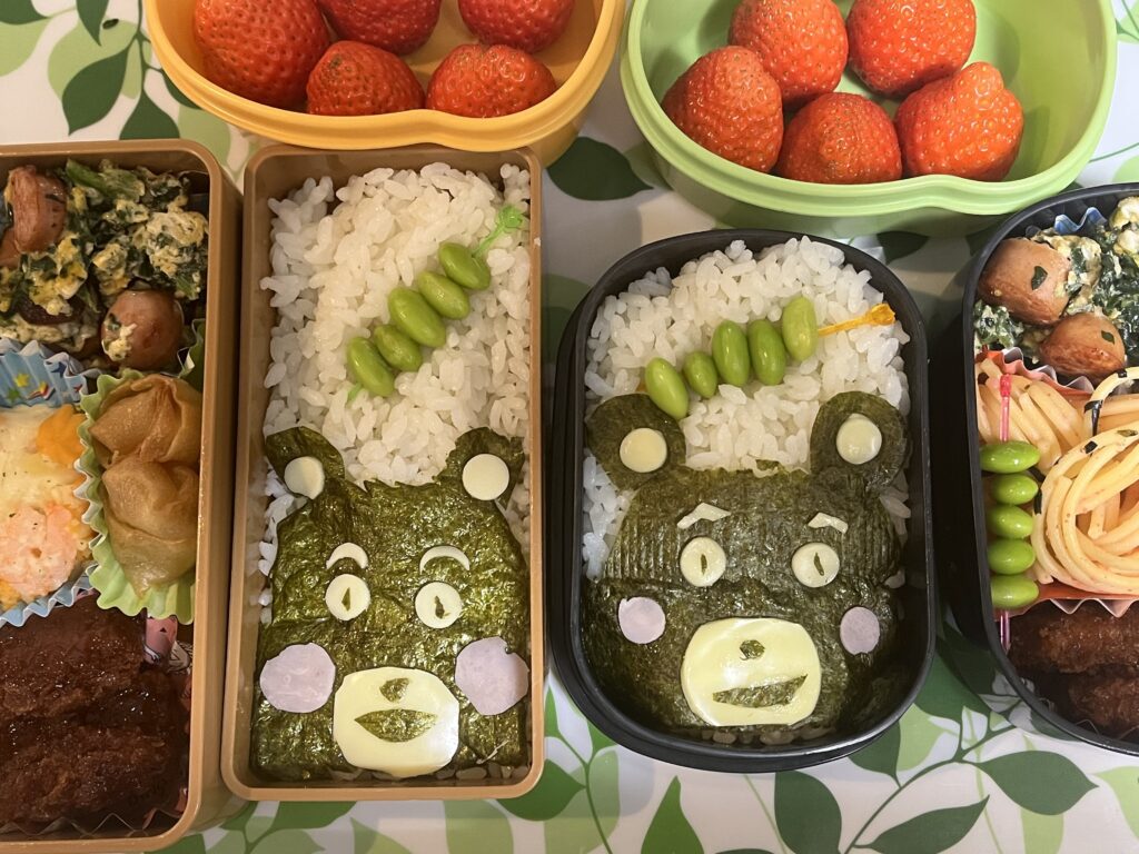 お面をかぶって豆まきをしたので、さっそくお弁当にもオニとお多福さん弁当