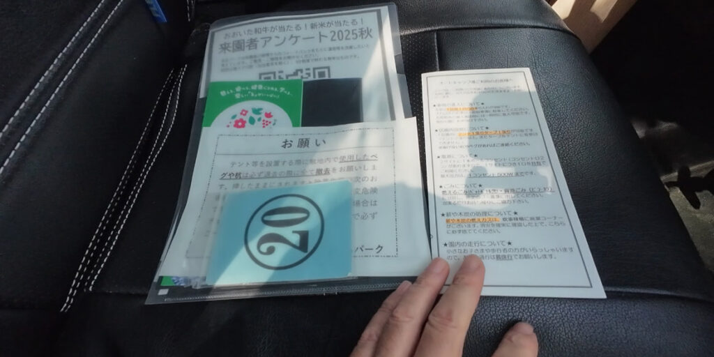 受付が終わるとキャンプサイトの地図、入場ゲートコイン(車で入場する際に必要)