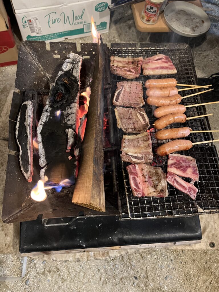 他にも焚火を楽しみながら、半分は炭火を使って、お肉やお野菜を焼いてバーベキューにしました😊