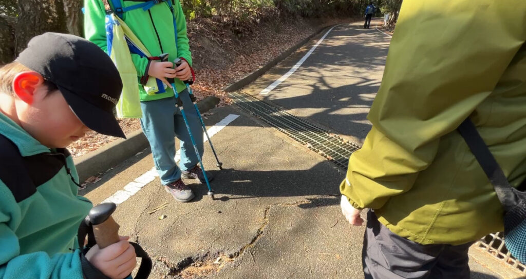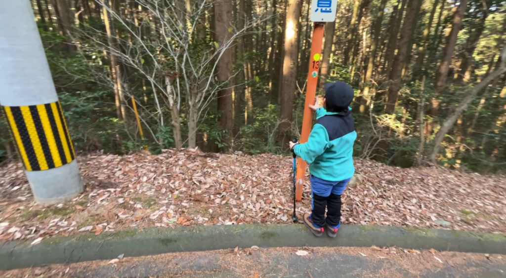 途中、倒木注意の三角コーンがあったり、木の根でアスファルトが剝がれている所が何箇所か有ります。つまずかないように足元に注意して進みましょう。