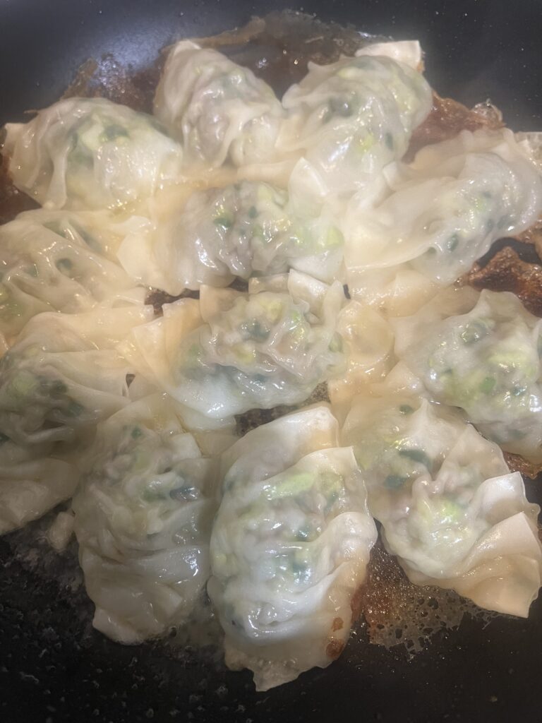 水分が抜けたらパリッと羽根つき餃子の出来上がりです😊