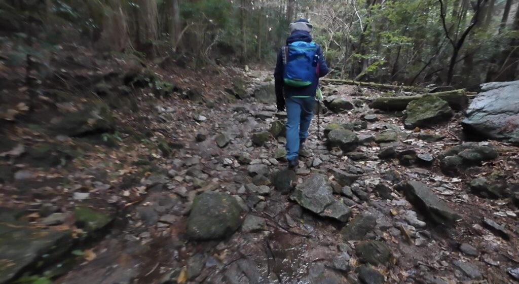 10分ほど進むと登山道は石や岩がゴロゴロ。慎重に進みます。