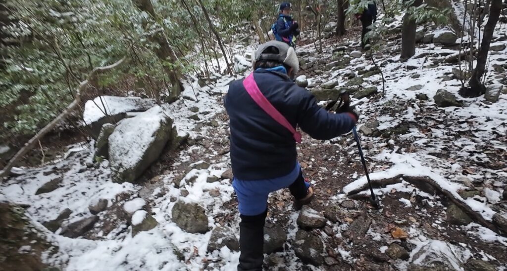 難所ケ滝まで600mの所でアイゼンを装着。登山靴だけでは滑ります。