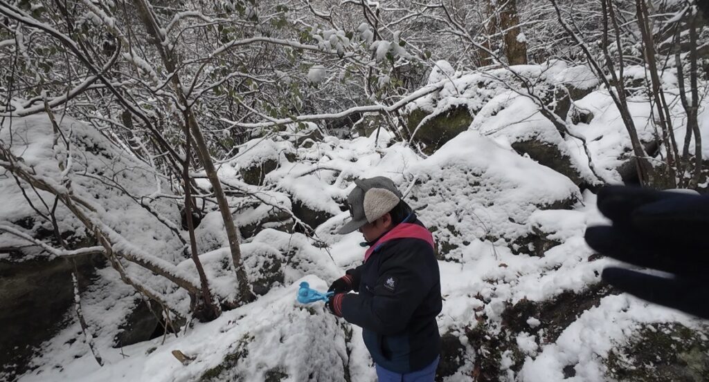しばらく進むと雪がちらほら。足元も少し雪が積もっています。