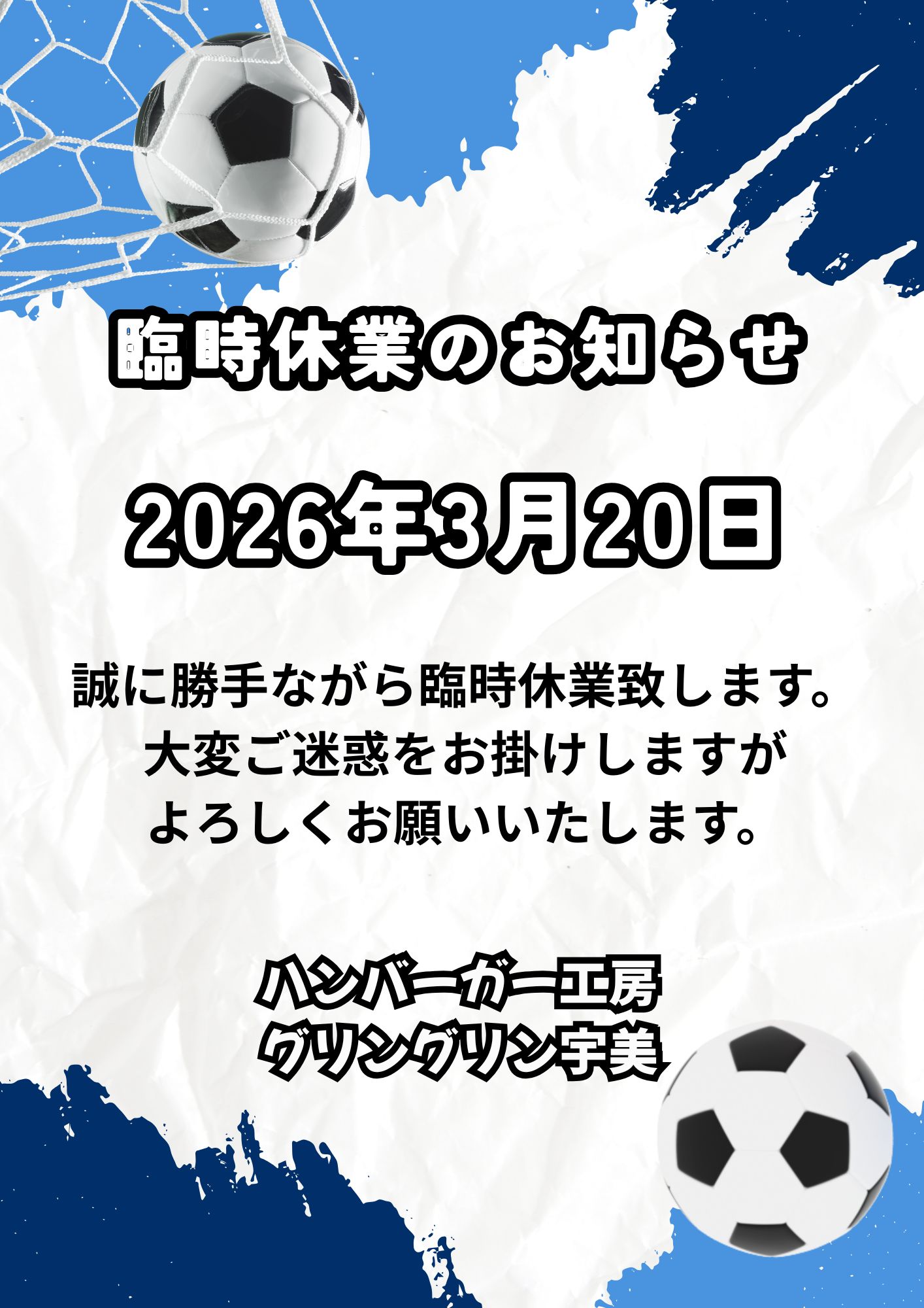 本日3月20日(金)は都合により臨時休業致します。